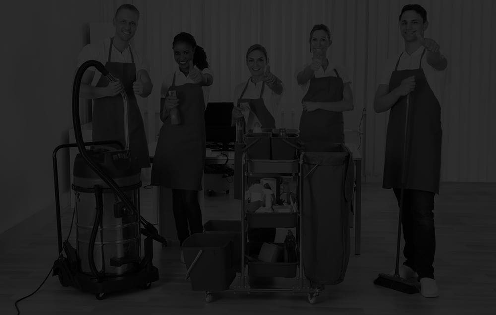 57364195 – group of happy cleaners standing with cleaning equipments in office